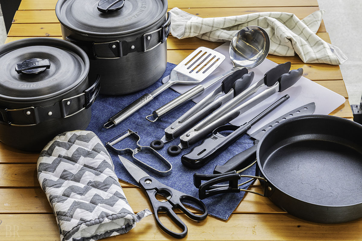 フライパン、鍋、おたま、ピーラー、フライ返し、トング、鍋つかみ、包丁、キッチンはさみなど